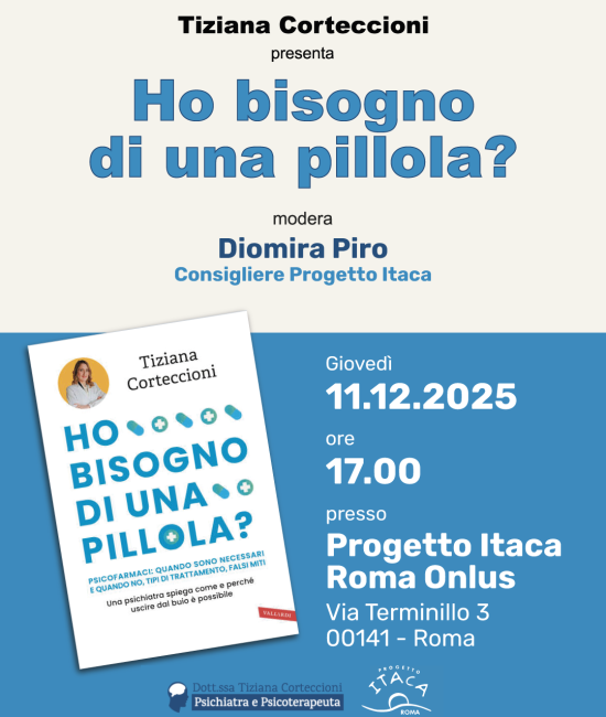 La Dottoressa Tiziana Corteccioni presenta nella sede di Progetto Itaca Roma il suo libro “Ho bisogno di una pillola?”